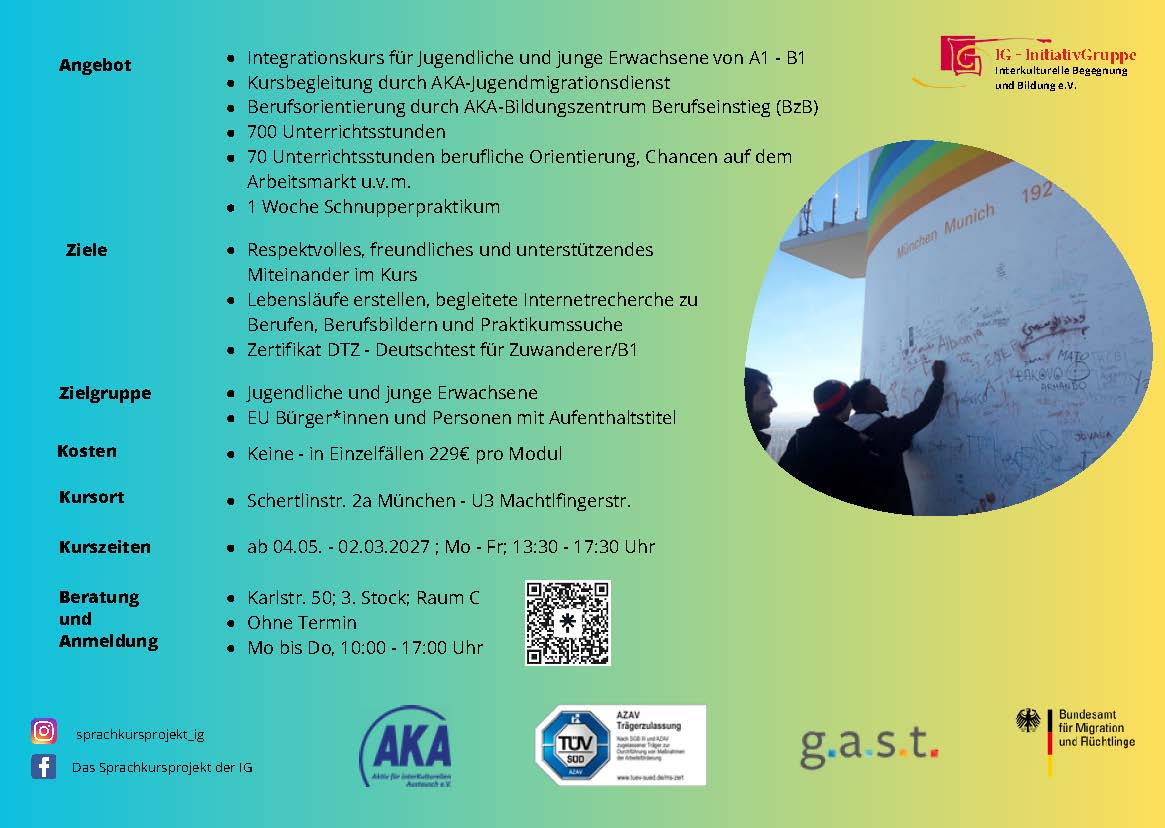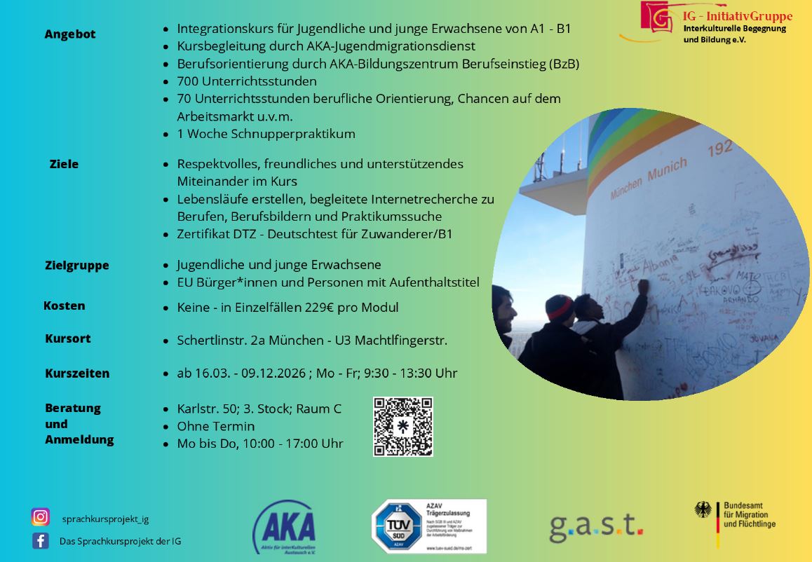 - Vermittlung deutscher Sprachkenntnisse für junge Teilnehmer von Niveaustufe A1 bis B1,sodass die Sprache in vertrauten Alltagssituationen selbständig verwendet werden kann